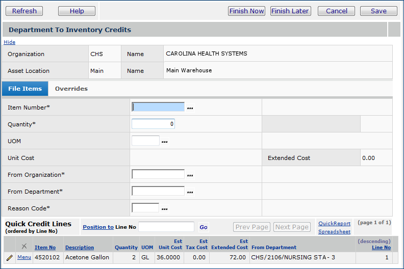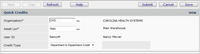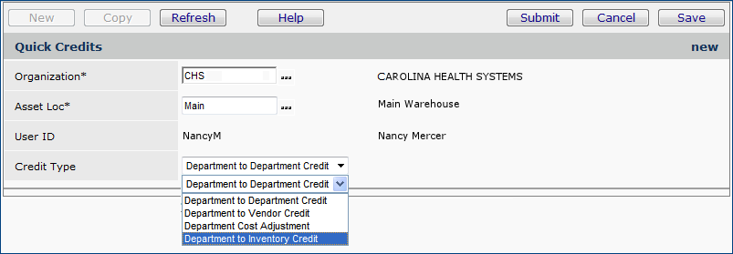 Department-to-Department Quick Credits is designed for situations in which you need to process multiple item credits between departments. With Quick Credits, you can credit multiple items from one department to another in a single step. The only constraint is that both the "credit to" department and the "credit from" department must have the same valid supplying asset location.