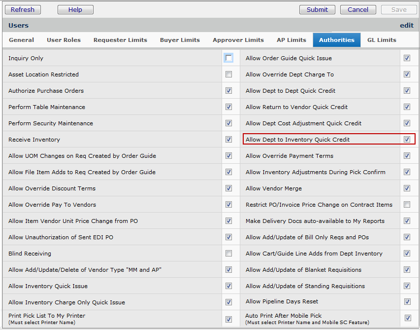 Users who create Department to Inventory Quick Credits must have the authorization set on their user profile's Authorities tab. The field