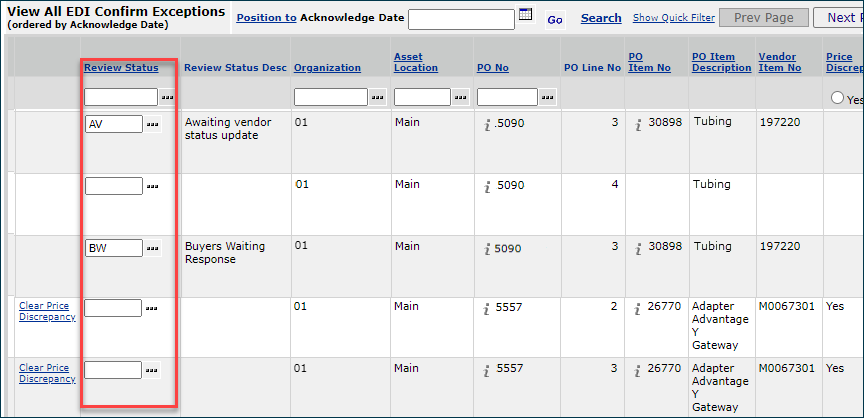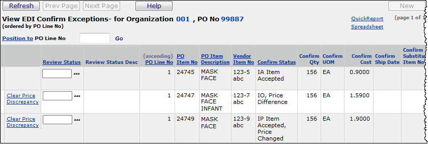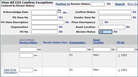 When a vendor confirms a purchase order in an EDI 855 document, the system imports the EDI 855 confirmation data, and updates the status of the PO. The application retains the data from the vendor, including any exceptions and makes the data available for your viewing. Exception information may refer to one or more lines on the PO, or all of the lines. You can review the information for individual lines, and for the PO as a whole. You can also open a list of all EDI PO confirmations with exceptions, and view individual confirmations from the list.