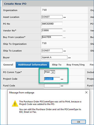 organization-level field controls the PO communication method and automatically sets it to Print when a Project Code is entered on a manual or system-generated PO. (No particular Project Code is needed. You can use any Project Code.)