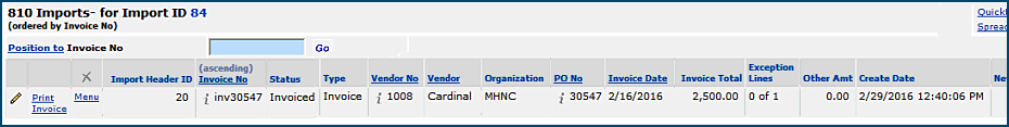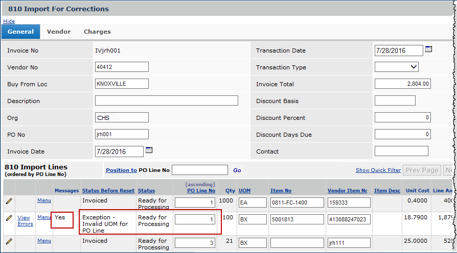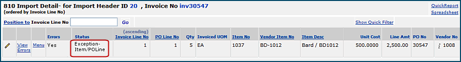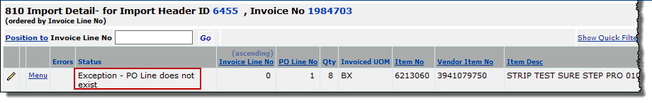 When the field is not selected, the 810 detail Status is Exception - PO Line Does Not Exist and the invoice is created as an exception (Figure 55). The 810 header status is Partially Invoiced and the invoice is created as Incomplete.