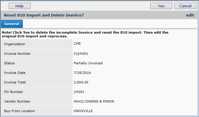 Field selected: A new EDI 810 will attempt to process when an incomplete  invoice is present for the same PO. The system deletes the existing incomplete invoice and resets the 810 that created the invoice to a status that will allow  it to reprocess as a new import.