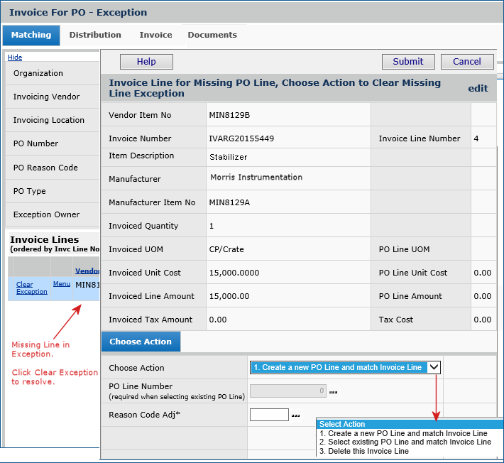 Missing lines can be processed from the Invoice Matching panel. When the missing line is added, the invoice has a missing line exception. You can then clear the missing line exception, and add the line either to the PO or invoice. Adding the line generates a receipt exception, which you can also then clear. (Also see Resolving Invoice Receiving Exceptions for more details.)