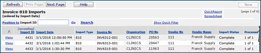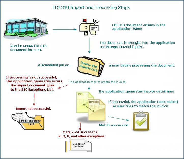 The EDI 810 Invoice Import feature imports invoice information, builds invoices, and matches invoice detail with receipt detail for referenced POs. EDI invoice matching follows the same match rules and tolerances used in regular invoice matching. Once an invoice has been built, exceptions and error corrections for the imported invoice use the same processes as manually entered invoices. You can process EDI 810 invoices for blanket, standing, bill-only, and regular POs.