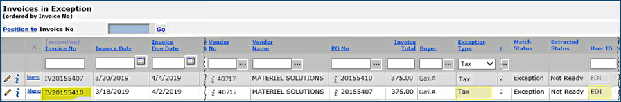 so the invoice in Figure 36 has an out-of-tolerance tax exception. The invoice also appears on the Invoices in Exception list with the Exception Type TaxEDI.