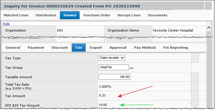 ERP compares the Tax Amount (Figure 36, red arrow) and the EDI 810 Tax Amount (Figure 36, green arrow).