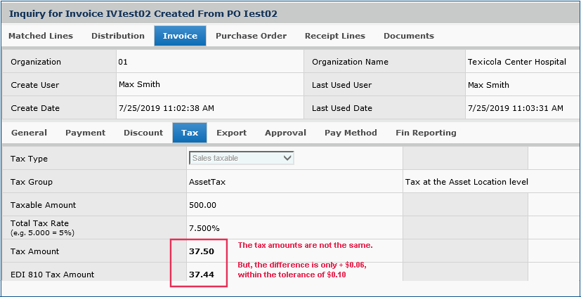 An EDI 810 invoice is processed with tax amounts that are not the same. Figure 40 is an inquiry on the invoice. The variance -- $0.06 -- is within the defined tolerance.