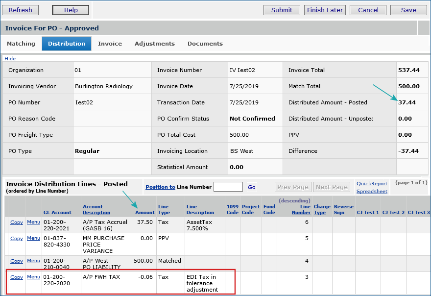 Editing the invoice and opening the Distribution tab displays the distribution line that ERP created for the in-tolerance tax variance