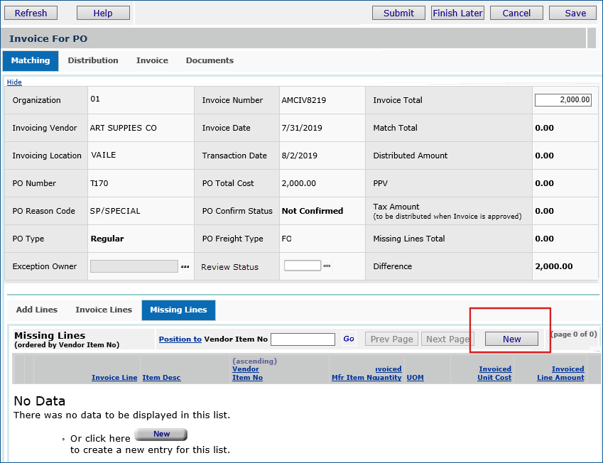 - To add a line from the invoice to the PO, select Create a new PO Line and match Invoice Line.