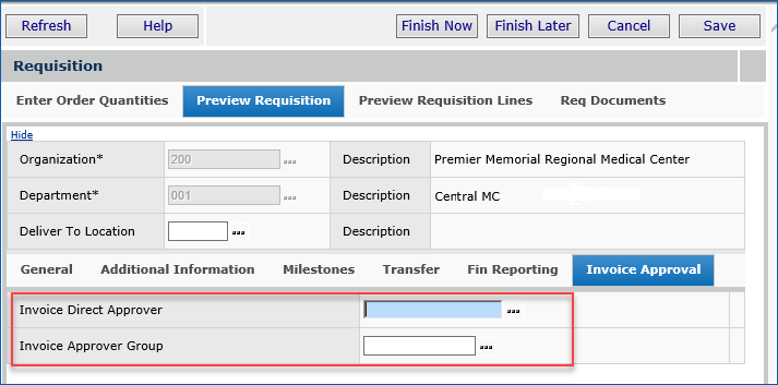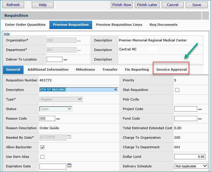 - On the requisition. The assigned approver/approver group propagates to the associated purchase order and EDI 810 invoice.