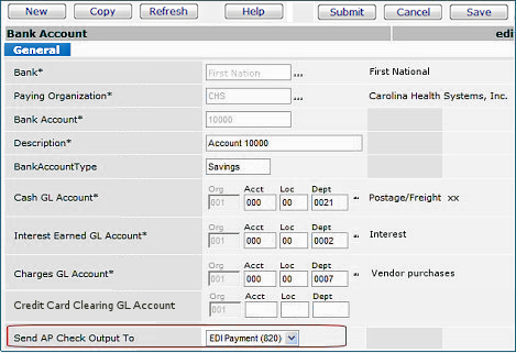 - On the Bank Account edit panel General tab, for the field Send AP Check Output To, select: EDI Payment 820.