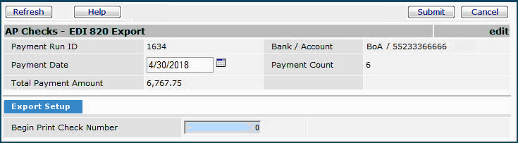 - From the AP Main Contents, select Imports / Exports > Payment Export 820 .