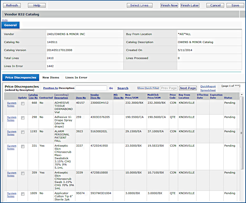 Using Select Lines, you can choose all price discrepancies -- or none; and you can choose all New items -- or none -- by checking or unchecking the appropriate box.