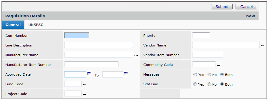 The Description column on a requisition line can contain either an Item Alias or an Item Description. The Search panel (Figure 3) for requisition lines lets you search the line Description. Clicking Search displays the Search panel for the requisition lines.