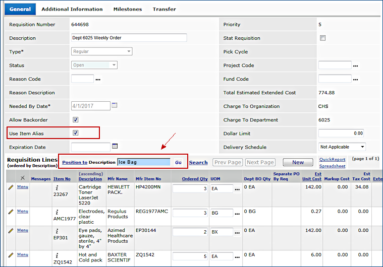 In Figure 2 for the same requisition, Use Item Alias is checked. The Description column contains the item alias for each item, if one exists. (If no item alias exists for an item, the Description is used.)