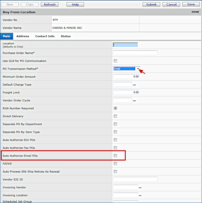 4. On the Main tab, select the PO Transmission Method of "Email."