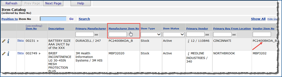 Some column headings in the Item Catalog -- Item No, for example -- may be underlined. Clicking on an underlined column heading sorts the column. In Figure 1, the cursor is on the column heading Manufacturer Item No. The user wishes to sort this column. See Search the Item Catalog for details on locating items in the item catalog.