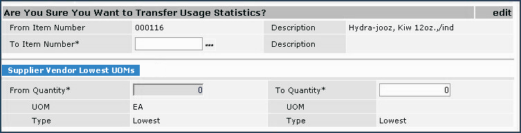 The Transfer Usage and Statistics feature lets you convert usage statistics from one item in the item catalog to another. You may find this feature useful if you need to create a new item number for an item that you already have in your catalog, but with a different unit of measure.