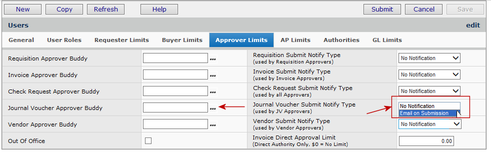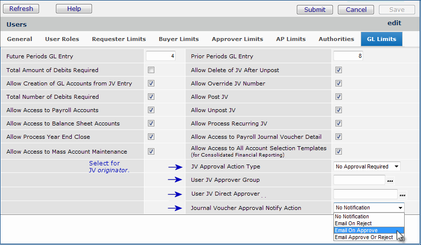 | 4. Select approval notification options for a user who creates journal vouchers. | Administration > Administration > Users > edit user > GL Limits tab |