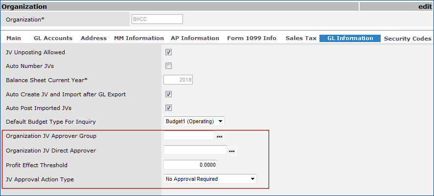 You can require approvals for journal vouchers whose Profit Effect exceeds a threshold that you set. The field Profit Effect Threshold on the Organization Edit panel's GL Information tab (Figure 12) is used for that purpose.