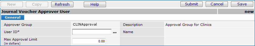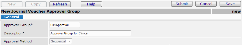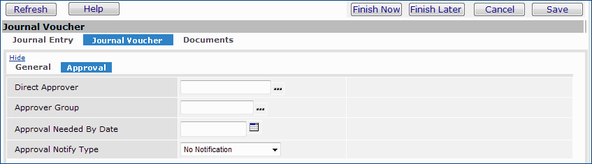 When you create a journal voucher, the Approval tab contains fields where you can identify the person or approver group responsible for approving the journal voucher, if none have been assigned for the organization or the user.
