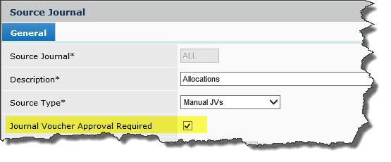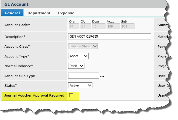 - Individual account codes for the organization can be flagged as requiring journal voucher approval.