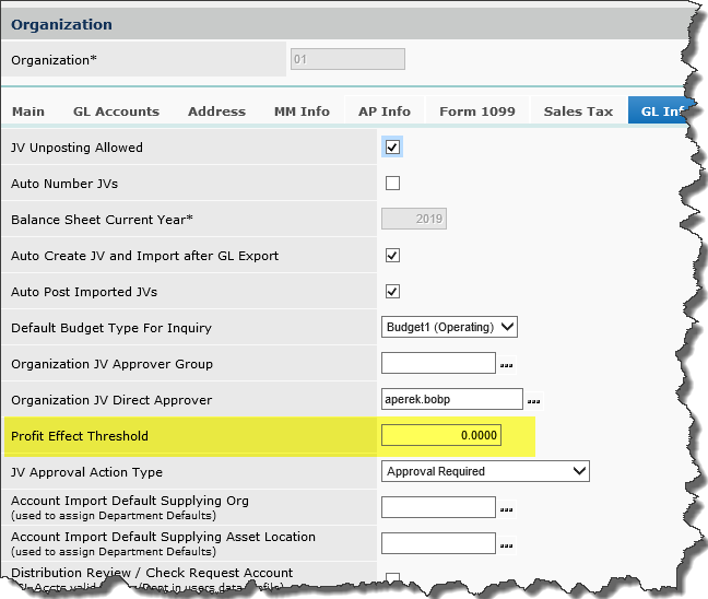 The Profit Effect Threshold is set for an organization on the Organization record's GL Information tab.