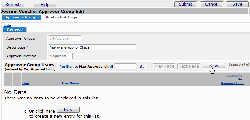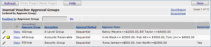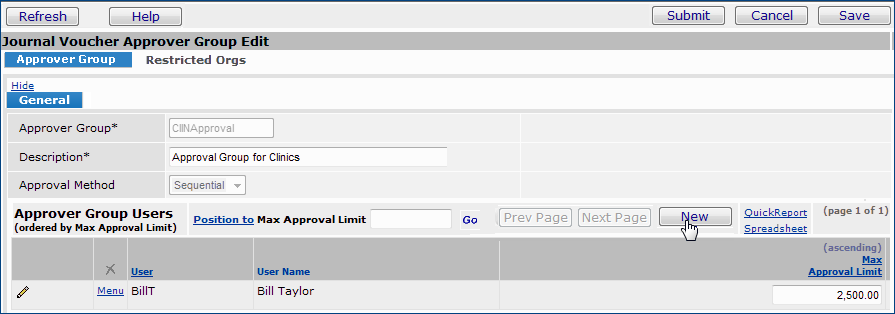 Note: A journal voucher approver group can be restricted by organization, if needed (as described below).