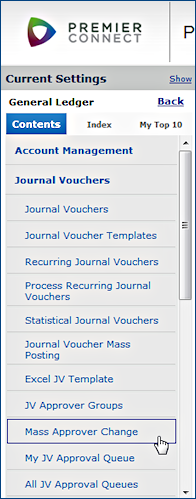 The mass approver   change feature lets you swap multiple approvers in and out of approver groups     for journal voucher approvals.