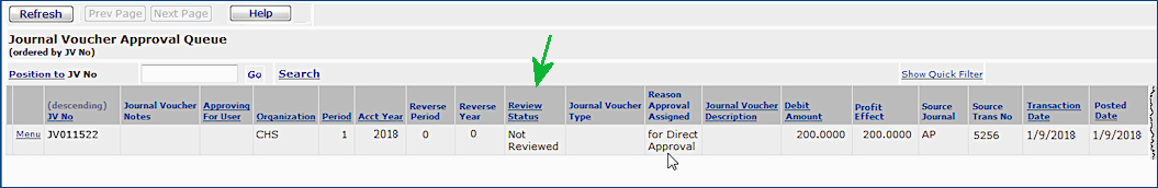 An all-approver queue of JVs awaiting approval is also available. This queue is useful for managers or others who have higher-level authority for all journal vouchers. (See Security for the role object setting.)