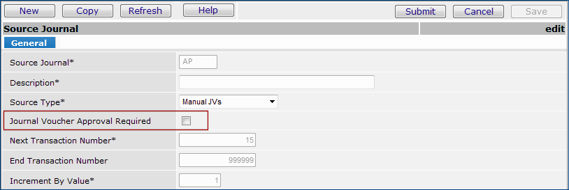 | 5. Identify source journals that need journal voucher approvals. | General Ledger > Tables > Source Journals > edit source journal |