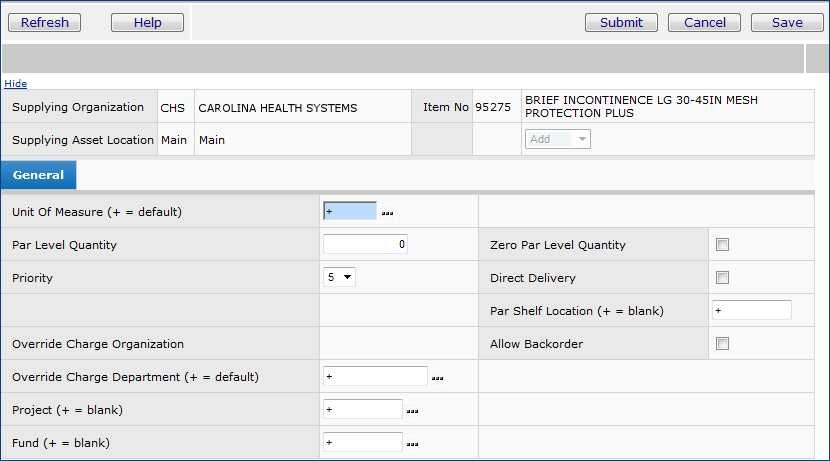 The maintenance utilities also allow you to select an item that is on at least one par cart, and update the item's information in multiple par carts. You can change various replenishment values for the item including: the unit of measure (UOM), quantity, par shelf location, override charge-to department, direct-delivery flag, project/fund code, and whether the item can be backordered. You can replace an item on multiple par carts as well.
