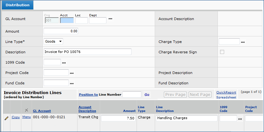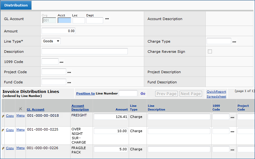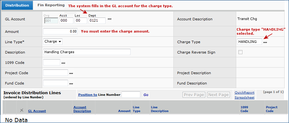 Invoices may contain additional charges such as freight, tax, and postage. When you match purchase orders and invoices, you can distribute dollars for such charges to the appropriate accounts by associating a Charge Type with each charge.