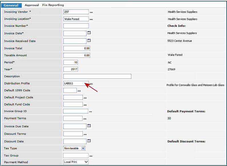 The method that you use to enter and match invoices depends on whether you have the authority to approve invoices for payment. If you are not an Invoice Approver, you must enter invoices as part of an invoice group. When the invoice group is complete, it must be approved by a user with invoice approval authority. If you have approval authority, you may enter and match invoices individually, or enter them as part of an invoice group. Completing an invoice match also approves the invoice, if you are an Invoice Approver. Invoice approval authority is set by your system administrator in your user profile.