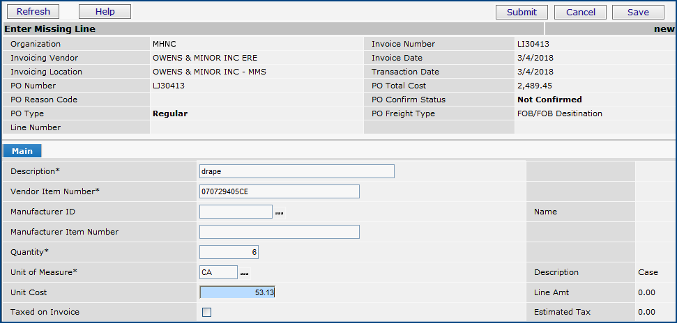 7. Review the fields on the header and invoice lines panels, and make changes if needed.
