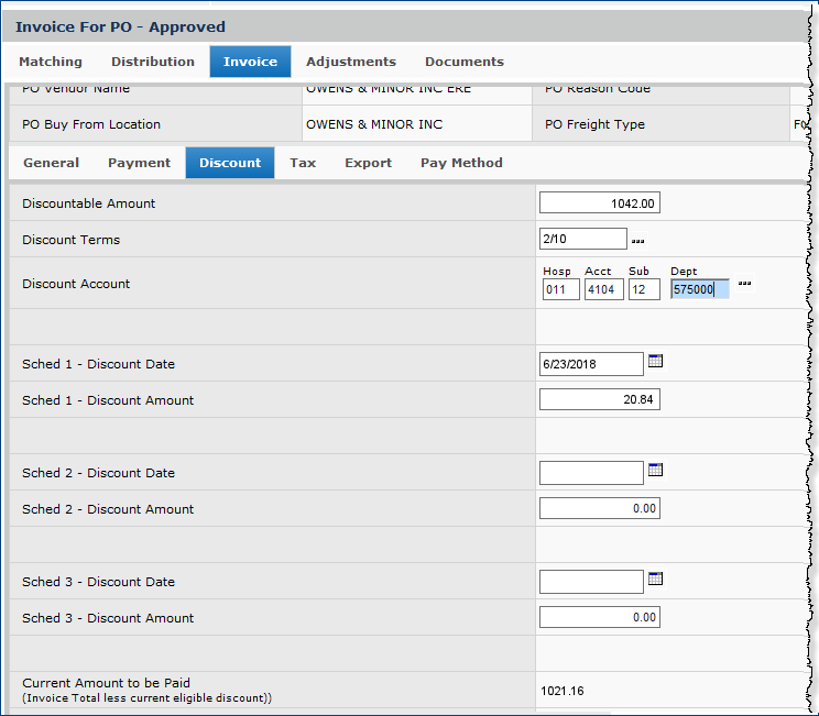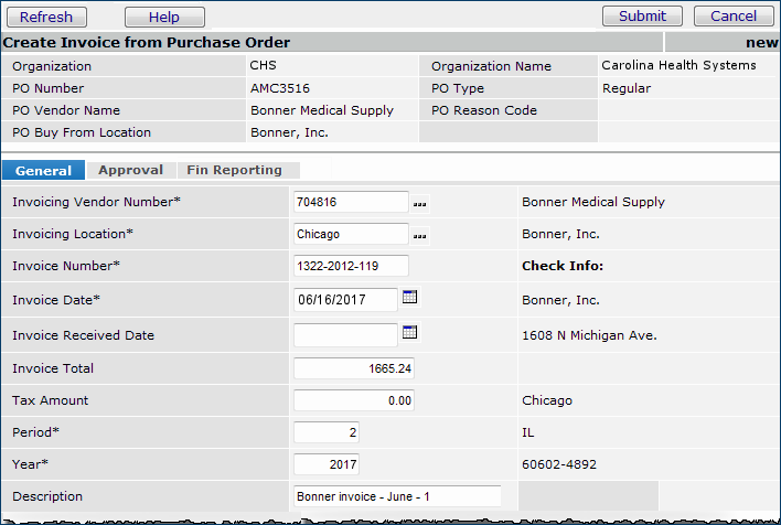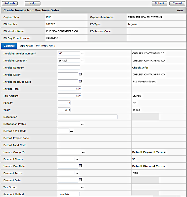You can create an invoice either from a PO that is ready for matching, or from a receipt, or from a scanned paper copy of the invoice. The procedure below describes how to create an invoice from a PO. The procedure is the same if you start with a receipt or with a scanned paper copy, except that the path is different.