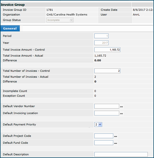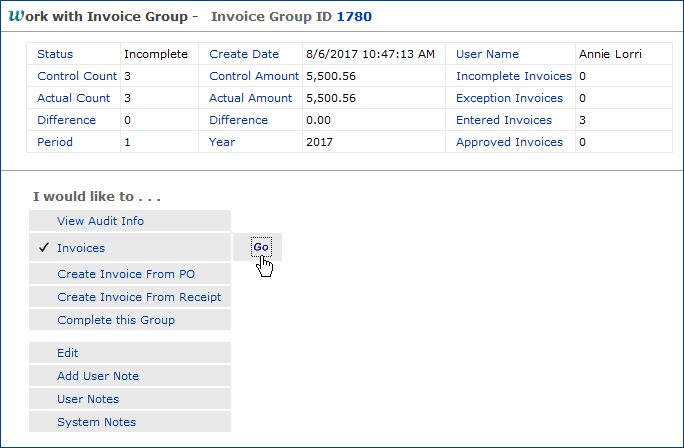 If you are an invoice approver, you may use an invoice group. For invoice approvers, the invoices in the group become approved when you complete the invoice group. In completing an invoice group, the system validates that the Control totals match the Actual totals for the number of invoices and for the amount. The invoice group status changes from In Process to Approved. No more invoices can be added to the invoice group at this point. Approved invoices are available to be paid.