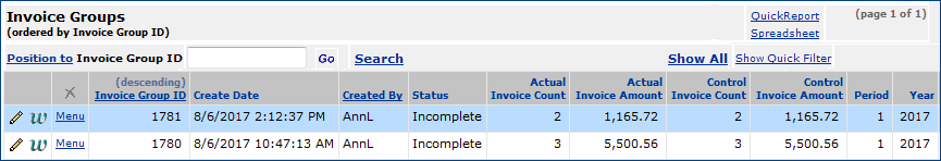 You can create collections of invoices known as invoice groups. Invoice groups are useful when you wish to separate the process of entering invoices from the process of approving invoices. Invoice groups also incorporate control totals.
