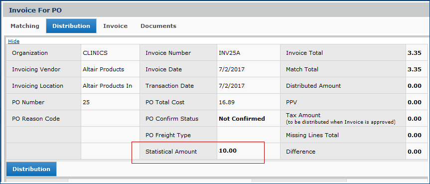 When the matching process is complete, the application creates invoice distribution lines for the matched and price variance amounts for future posting to GL accounts. For more detailed information about account transactions during invoice matching, see the summary of General Ledger transactions.