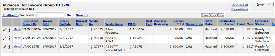1. To look at the match between an invoice and a PO associated with it, from the AP or Materials main Contents, select: Invoicing > Invoices to display the Invoices list. Review the value in the Match Status field in the center of the line for any invoice in the list.
