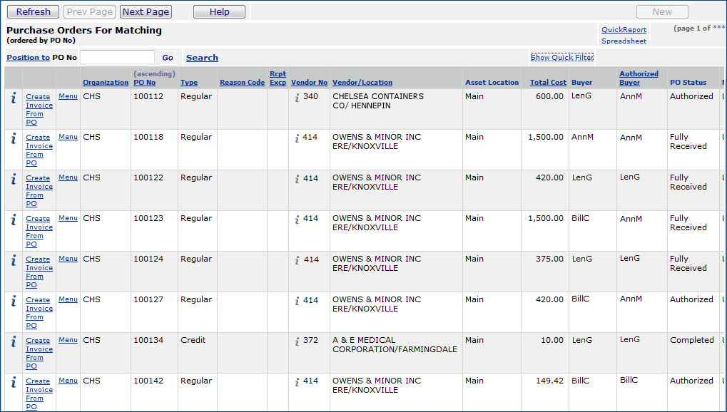 1. From the Materials Management or Accounts Payable main Contents, select Invoicing > Create Invoice from Purchase Orders. The Quick Click menu appears.