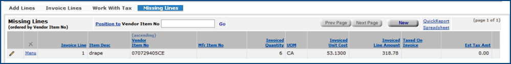 3. Select Menu > Edit, or click the edit icon. The Invoice Matching header and the tabbed invoice detail lines lists appear.
