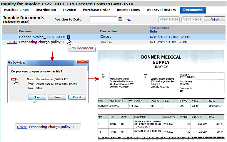 Bill-only purchase orders may contain "bill-only" lines for non-file items, such as implants delivered to an OR for a procedure. These items are receiptless and do not replenish stock. When an invoice is created for the associated bill-only PO line, as with all receiptless items, the system makes a receipt available for matching.