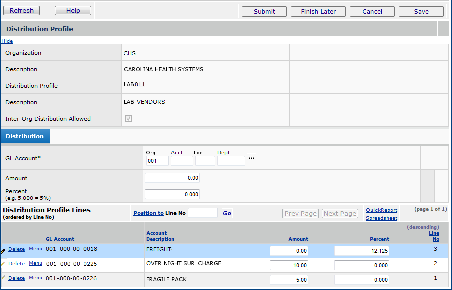 If you have invoices that contain the same charges over and over, you can create Distribution Profiles to build the charge lines in advance. Specifying a Distribution Profile on an invoice that you are matching calls in the pre-built lines.