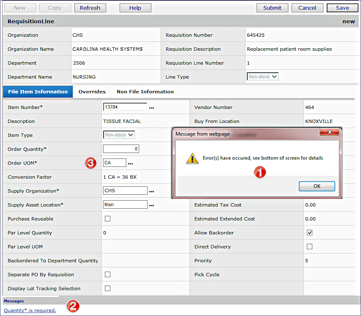 click the error message at the bottom of the panel, the message is highlighted, and the field with the problem is also highlighted. - Correct the