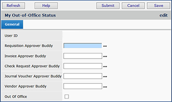 Click Submit. The system sets your out-of-office status and reroutes invoices/requisitions and/or check requests that you normally approve to your approver buddy.