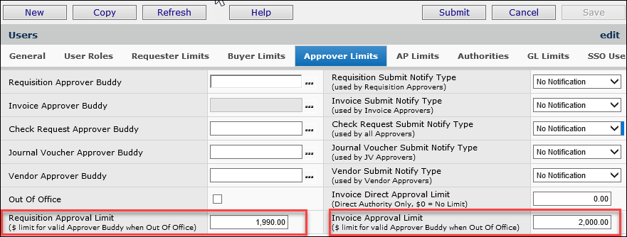 On the Out-of-Office status panel, the select list from the prompt for an approver buddy only displays users with approval limits equal to or greater than the approver going out-of-office. The actual dollar approval limits for each user on the list are not displayed because that information remains confidential. Only the User ID and User Name appear.