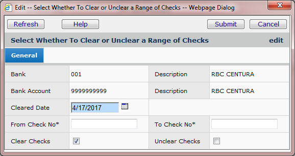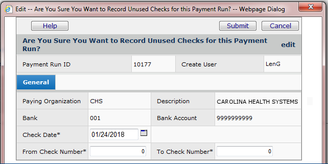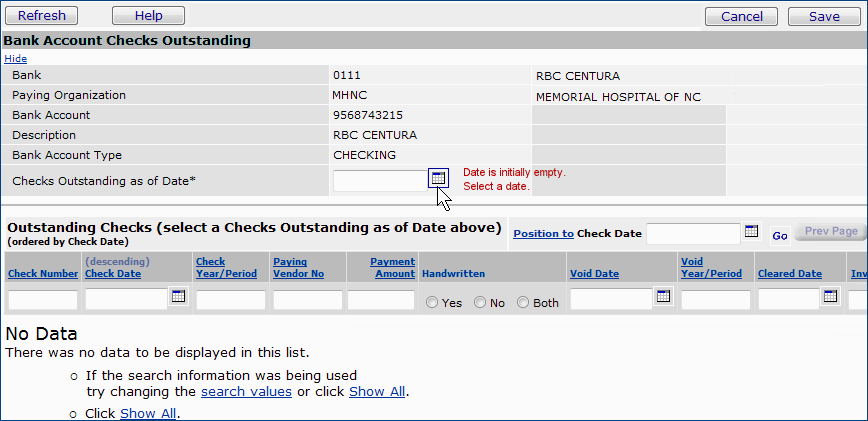 1. Enter information in fields marked with an asterisk (*). Use the fields to specify your criteria for uncleared checks that the system should select. For example, in the Check Date fields, you may need to enter dates for uncleared checks of over 180 days, or for whatever timeframe is standard for your organization/state. Figure 68 is an example. (Click Help for detailed descriptions of fields.)