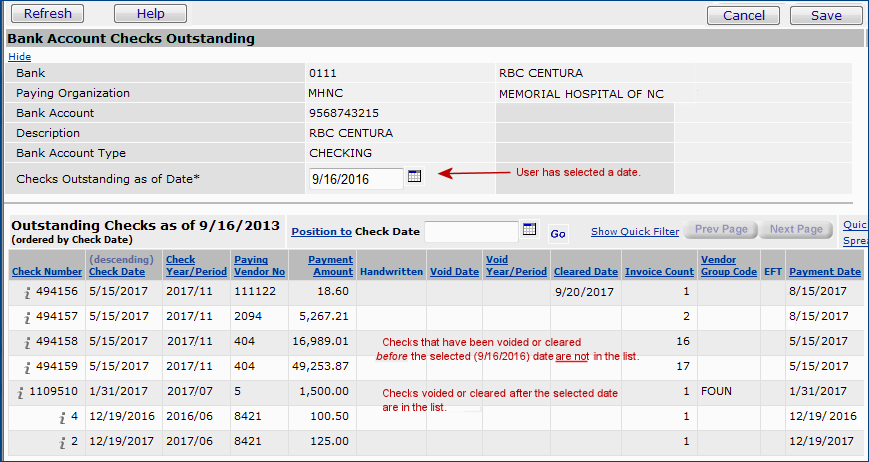 Checks that have been voided or cleared after the selected date appear in the list, along with the outstanding checks. The voided date and year/period is displayed, along with the cleared date when relevant.