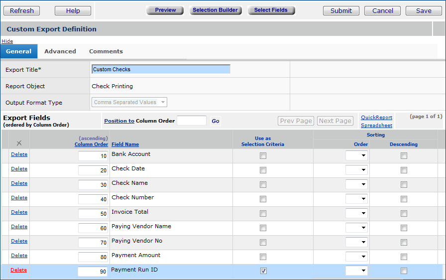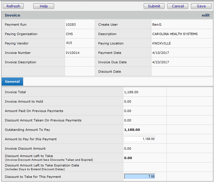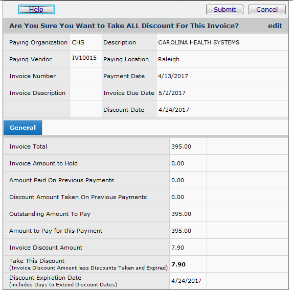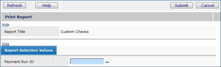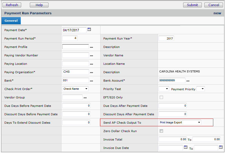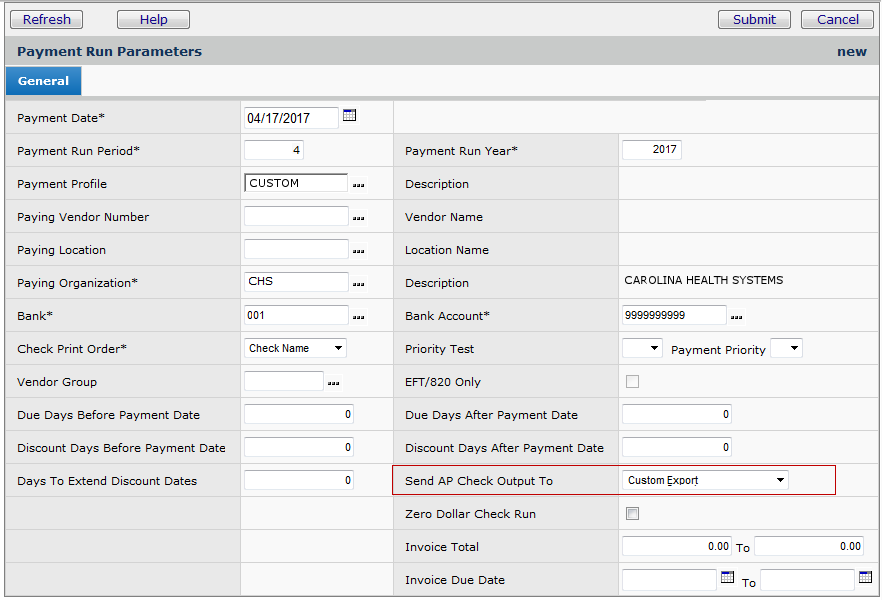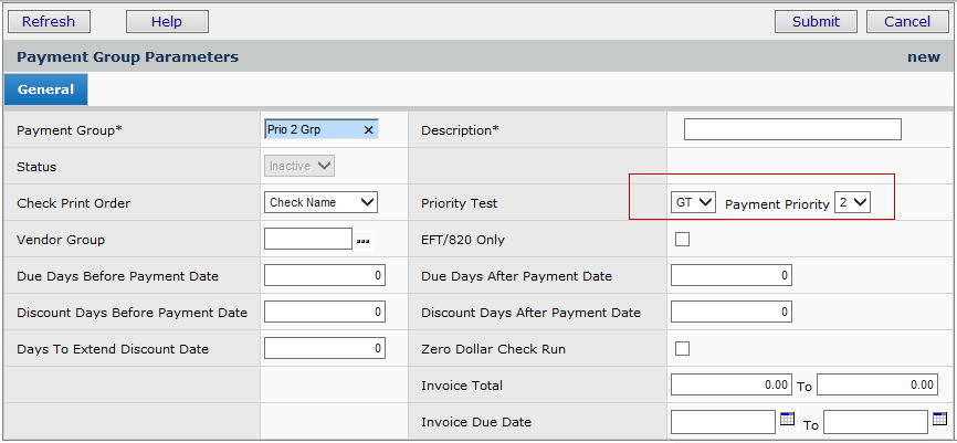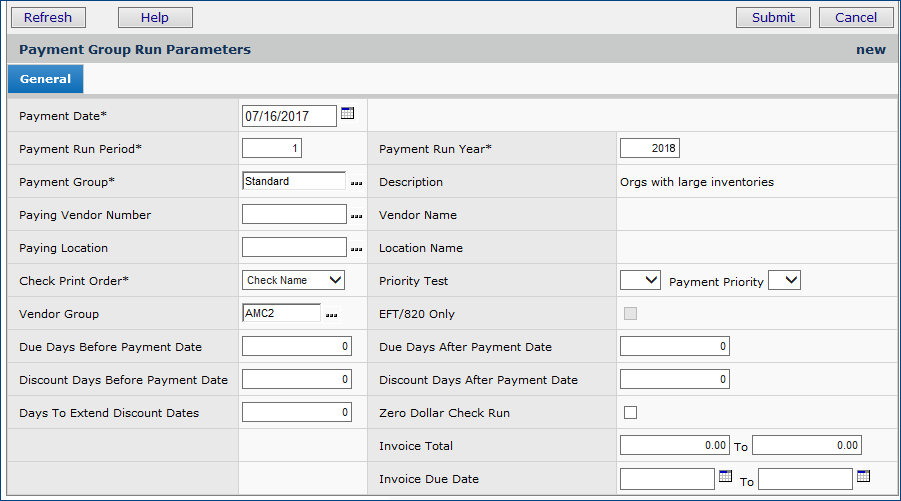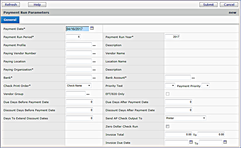 Enter information in fields marked with an asterisk (*). Use the other fields to specify your criteria for invoices that the system should select. For example, you may want to pay all invoices with four Discount Days Before the Payment Date. Or, you may wish to select invoices from a certain Vendor Group that have a particular Payment Priority. If you enter no selection criteria, the system includes all approved invoices for the Paying Organization in the payment run. (Click Help for detailed descriptions of fields.)
